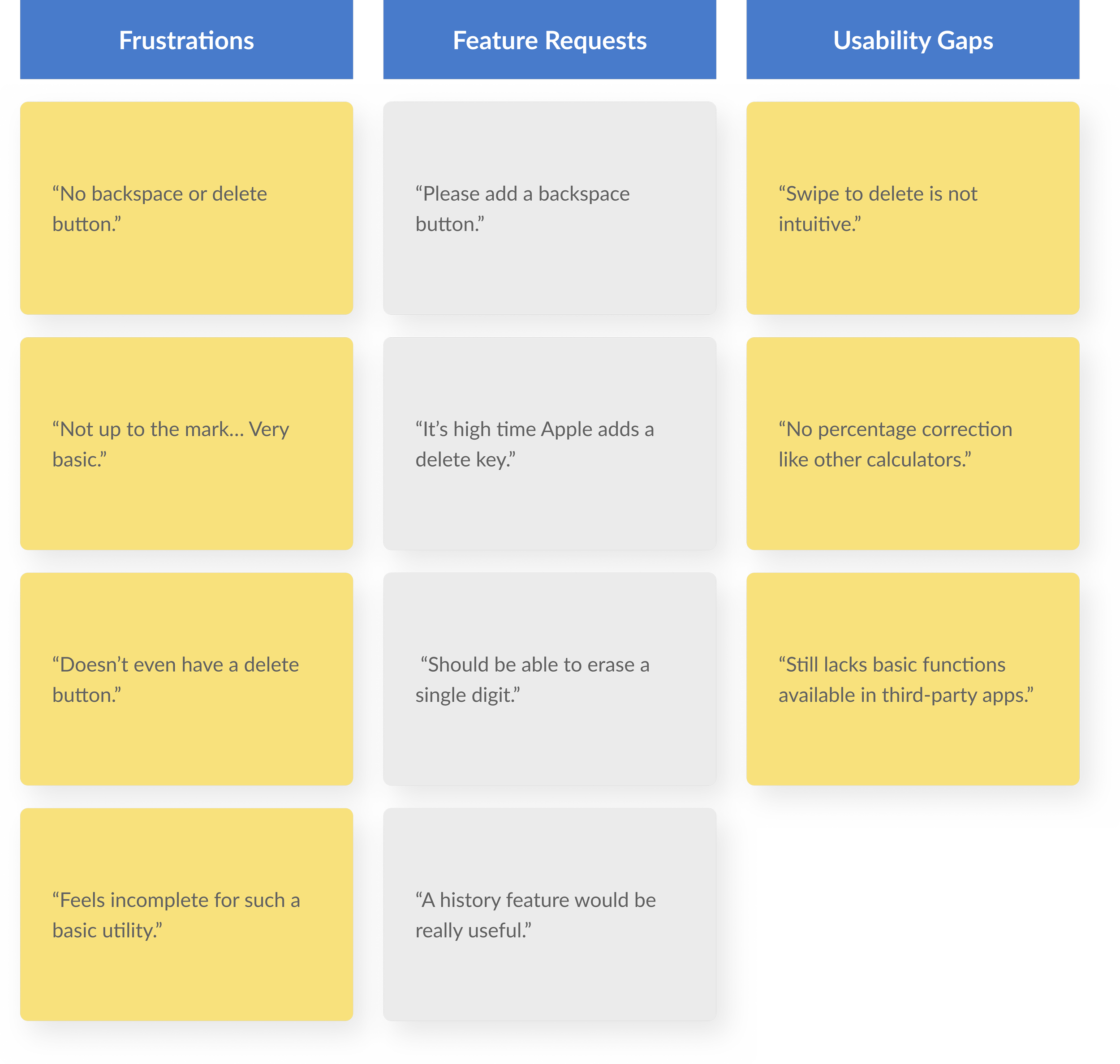 I also analyzed public reviews of the Apple Calculator app on the App Store to uncover recurring pain points, feature requests, and usability gaps directly from real users.